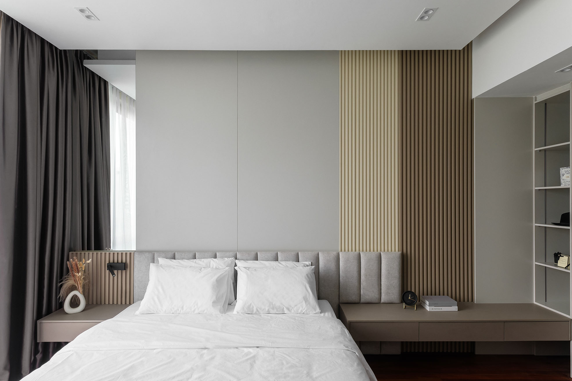 This residence at Picasso Residence explores a monochrome palette inspired by cement and concrete textures.