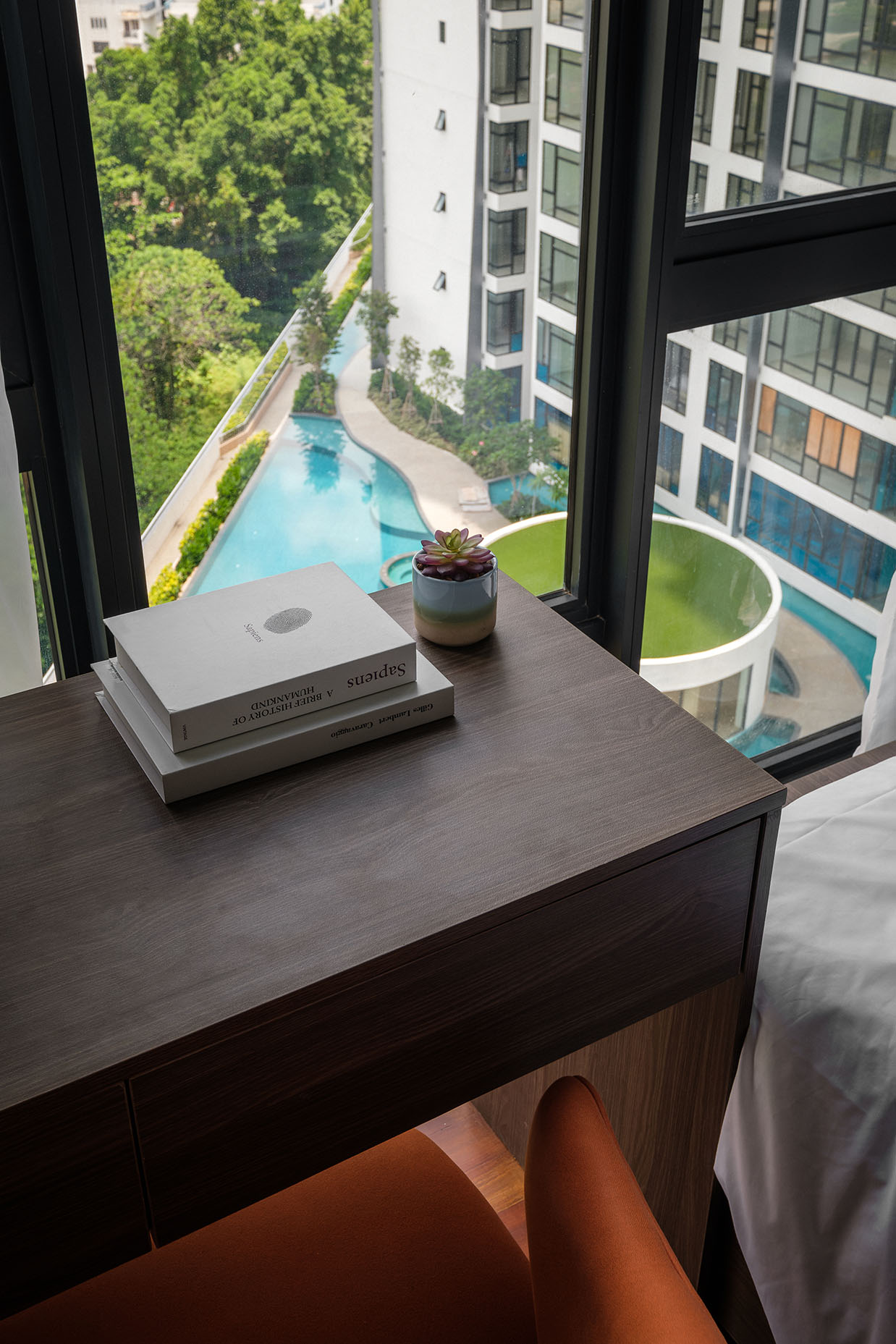 Black, white, and grey tones create a modern architectural base, while warmer creamy hues soften the overall environment.
