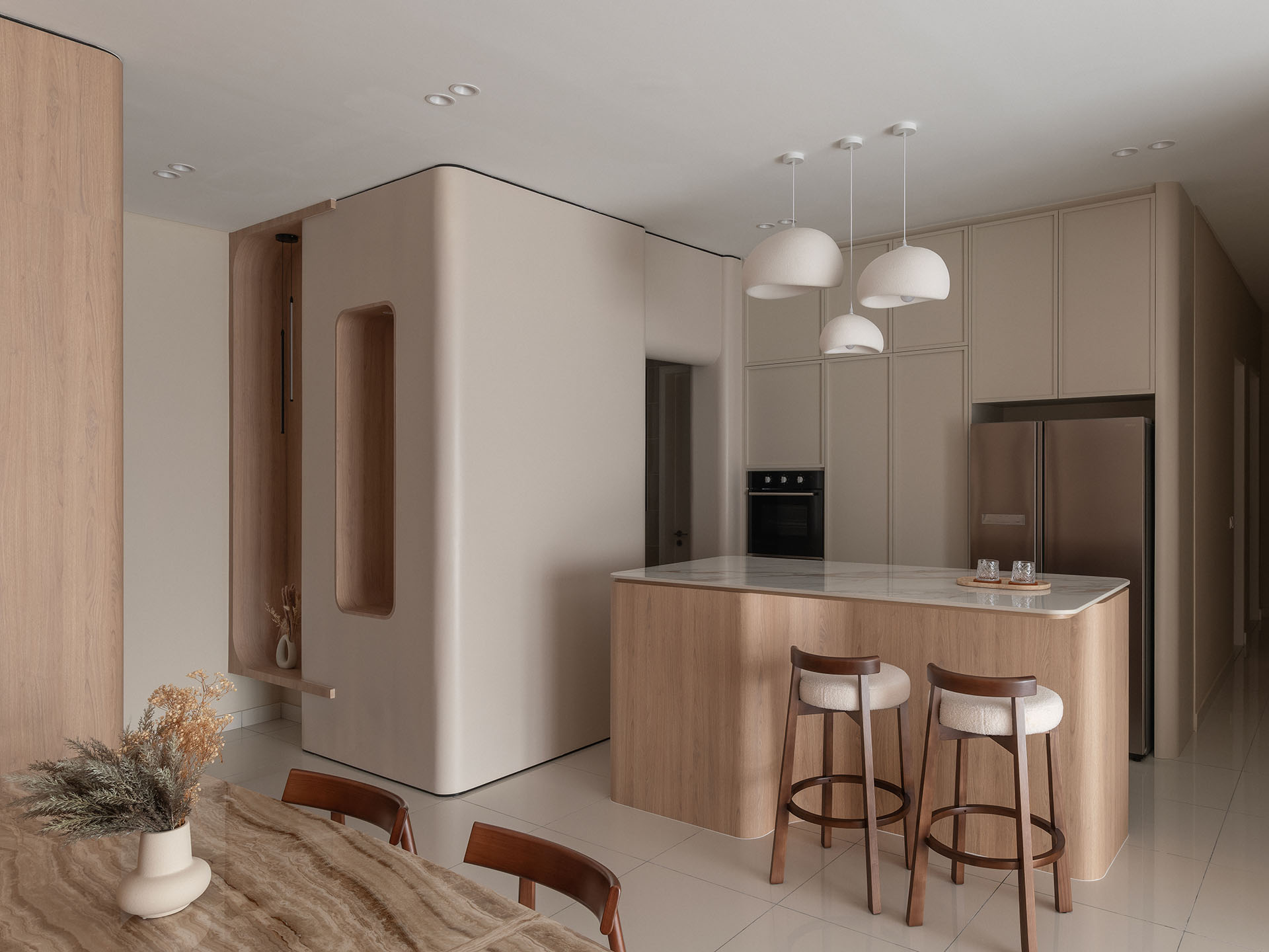 In the kitchen, warm ambient lighting highlights the veined marble-effect surfaces, while matte cabinetry and natural wood tones balance elegance with everyday practicality. Every detail, from hidden storage to the delicate interplay of textures, is designed to support modern living without compromising on beauty.