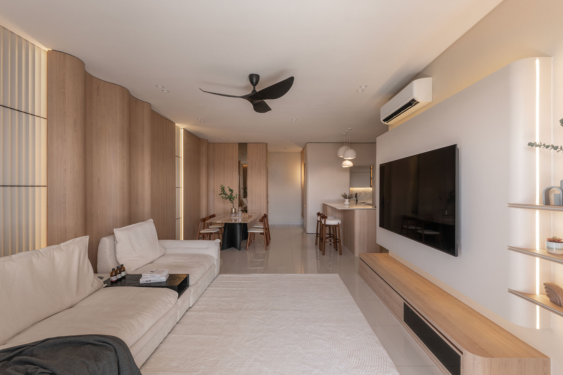 The living area, bathed in natural light through full-height windows, extends into a serene composition of wood textures and neutral palettes. The wave-inspired wall panels and rounded cabinetry edges lend a sculptural quality, transforming functional elements into artful statements.